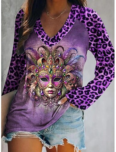 Karnevaali Mardi gras Naisten T-paita Painettu Ombre Kuvitettu Leopardi Tyylikäs Klassinen Vapaa-aika Pitkähihainen V kaula-aukko Tavalliset topit Päivittäin Bile Viikonloppu Purppura Apila Kes