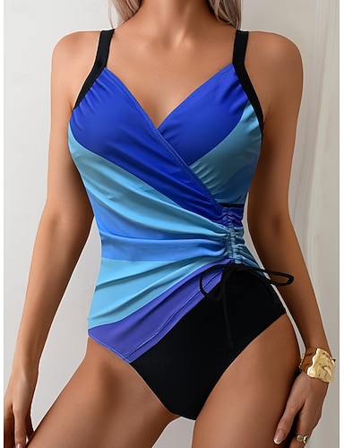 Naisten kokonais uimapuku hoikentava ryppyinen värilohkoinen monokini vatsanhallinta korkeavyötäröinen hoikka selkä paljaana lomaranta-asu ombre V-kaula-aukko olkaimeton uimapuku