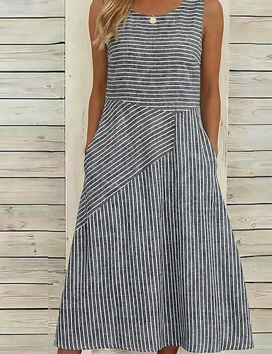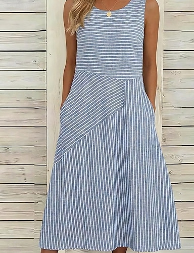 Naisten Midi Mekko Pellavanomainen Kesämekko Siirrosmekko A-linja Mekko Loma Rentoutuminen Boho Ranta Ulkona Irtonainen Fit Graafinen Geometrinen Hihaton Pyöreä Kaula Sininen Valkoinen Keltainen