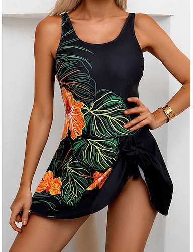 Naisten yksiosainen uimapuku hameella lomarantaasuja kukkakuviolla U-aukko ilman hihoja