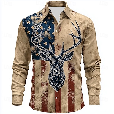 Miesten Poro Yhdysvaltain Yhdysvaltain lippu Paita Button Up paita Pitkähihainen Vintage retro ulko- Retkeily ja vaellus Metsästys Kevät Syksy Sänkyjen avaus 3D-tulostus Pellava kuin paita Khaki