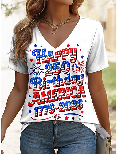 Amerikan itsenäisyyspäivä Naisten T-paita Painettu Kuvitettu Lippu Vintage Tyylikäs Klassinen Lyhythihainen V kaula-aukko Tavalliset topit Päivittäin Musta Valkoinen Rubiini Khaki Kesä Kevät
