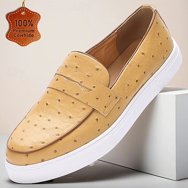 Miesten keltaiset aidosta nahasta valmistetut strutsikuvioiset loaferit pehmeällä pohjallisella ja liukumattomalla kumipohjalla, ylelliset vapaa-ajan slip-on-kengät työ- ja viikonloppukäyttöön.
