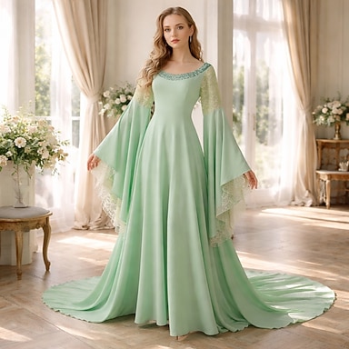 A-linjainen latupituinen häät vieraspuku viralliset puvut iltapuku morsiamen äidin puku pitkähihainen pyöreä kaula-aukko elegantti vintage-juhlava laskoksilla väriestetiikalla