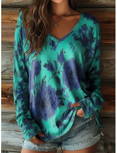 Naisten T-paita Painettu Kuvitettu Solmuvärjätty Vintage Vapaa-aika Boheemi Pitkähihainen V kaula-aukko Tavalliset topit Päivittäin Sininen Kesä Kevät Syksy