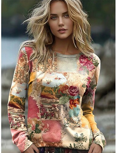 Naisten boho T-paita graafinen vintage muoti tyylikäs pitkähihainen pyöreä pääntie säännölliset yläosat arkikäyttö viikonloppu printti vaaleanpunainen violetti vaaleansininen kesä kevät
