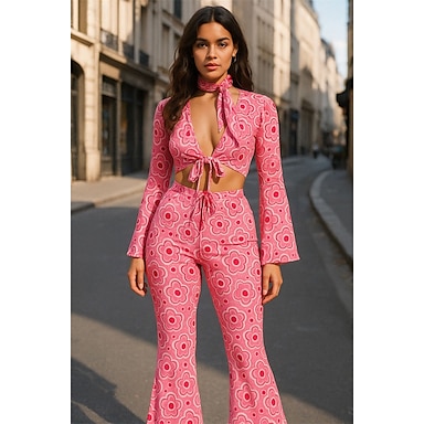 Retro / vintage 1970 luku Asut Lyhyt toppi Bell Bottom Housut Hippi Rusetti Kukka Naamiaispuku Naisten Halloween Karnevaali Naamiaiset Juhla Arki-asut Aikuisten Toppi Housut Kevät kesä