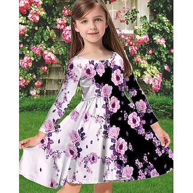 Tyttöjen 3D Kuvitettu Mekko Pitkähihainen Kesä Kevät Loma Päivittäin Pyhäpäivä Prinsessa Kaunis Makea Lapset 4-12 vuotta Rento mekko A linjainen mekko Polvipituinen Normaali