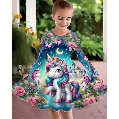 Tyttöjen 3D Yksisarvinen Mekko Pitkähihainen Kesä Kevät Loma Päivittäin Pyhäpäivä Prinsessa Kaunis Makea Lapset 4-12 vuotta Rento mekko A linjainen mekko Polvipituinen Normaali