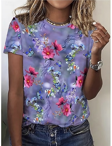 Naisten T-paita Painettu Kukka Kuvitettu Kasvit Tyylikäs Klassinen Vapaa-aika Lyhythihainen Tiukka pyöreä kaula-aukko Pyöreä kaula-aukko Pitkät topit Päivittäin Keltainen Purppura Apila Kesä Kevät