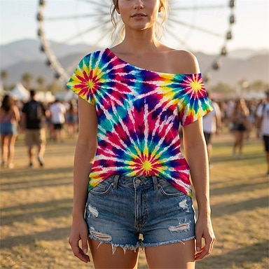 Retro / vintage 1980 luku T-paita Yksiolkaiminen Lyhyet hihat Hippi Disko Solmuvärikuosi Naamiaispuku Naisten Halloween Karnevaali musiikkifestivaali Retro-teemaiset juhlat Aikuisten T-paita