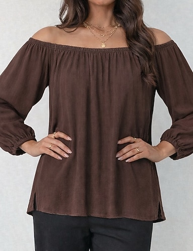 Naisten Toppi avoimilla olkilla T-paita Side split Laskokset Yhtenäinen väri Tyylikäs Vintage Vapaa-aika Pitkähihainen Lyhtyhiha Olkaimeton Tavalliset topit Päivittäin Bile Kahvi Kesä Kevät Syksy