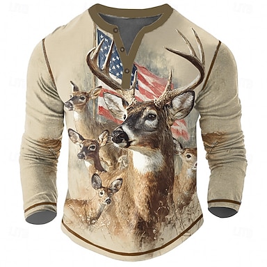 Miesten Yhdysvaltain Yhdysvaltain lippu Hirvet Henley-paita T-paidat Pitkähihainen Vintage Muoti Tyylikäs Kausaliteetti Päivittäin ulko- Syksy 봄 & Syksy teen ruskea Khaki Henley kaulus Henley Henley