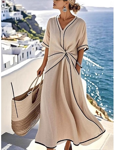 Naisten Midimekko Keinopuuvillainen pellava Väljä mekko Tyylikäs Vintage Perus Kausaliteetti Päivittäin Loma Normaali Tavallinen Lyhythihainen V kaula-aukko Sininen Valkoinen Apila Khaki Kesä Kevät