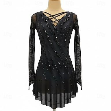 Taitoluistelupuku Naisten Luistimet Hameet Musta Tilkkutäkki Avoin selkä Erittäin elastinen Kouluts Kilpailu Luisteluasu Klassinen Kristalli / Strassi Pitkähihainen Luistelu Taitoluistelu