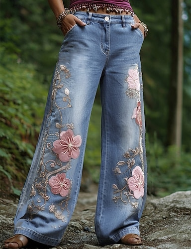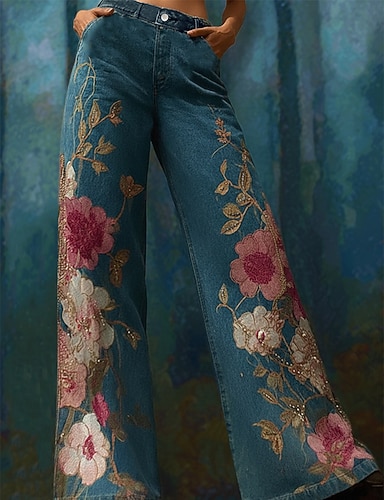 Naisten Leveä reisi Kiinalainen Loma Vintage Etninen tyyli Täyspitkä Korka vyötärö Kukka Kuvitettu Tasku Tulostus Mukava Pehmeä Mikrojoustava ulko- Loma Katu Sininen Kevät Syksy Talvi Loose Fit