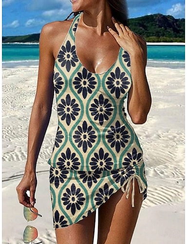 Naisten Uima-asut Tankini 2 kpl Alushousut Uimapuku Avoin selkä Loma Ranta-asut Kukka Kuvitettu Riipuskaula Hihaton Uimapuvut