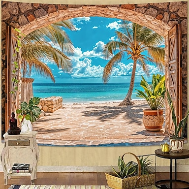 rantamaisema ikkunakuvakudos trooppinen valtameri palmu merenrantaseinä tausta kesäinen seinämaalaus olohuoneeseen makuuhuone toimiston sisustus