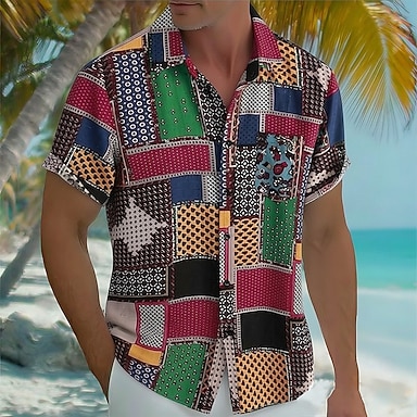 Miesten Väripalikka Tilkkutäkki Boheemi Paita Kesä paita Button Up paita Lyhythihainen Vintage retro Rento / arki Rantaloma Kesä Sänkyjen avaus 3D-tulostus Edessä yksi tasku Pellava kuin paita