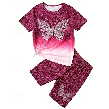 Tyttöjen 3D T-paita ja shortsit Setti Lyhythihainen Kesä Kevät Urheilu Muoti Päivittäin Lapset 4-12 vuotta Tiukka pyöreä kaula-aukko ulko- Loma Urheilu Räätälöity istuvuus