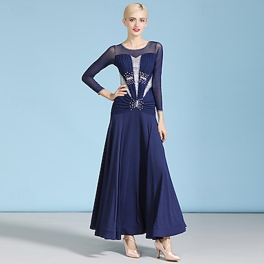 naisten tummansininen tanssiaismekko strassikivillä koristeltu rypytetty yläosa läpikuultava verkko pitkähihainen valssipuku moderni vakiokilpailuasu