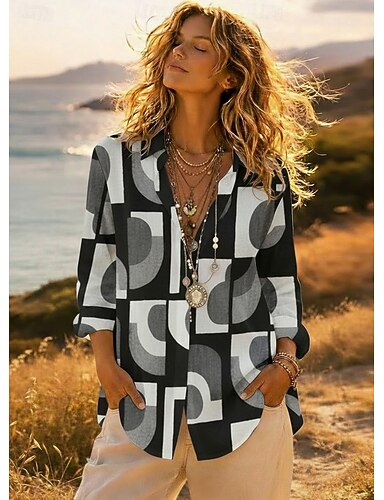 naisten geometrisella kuviolla varustettu napitettava pitkähihainen rento löysä pusero taskuilla arkeen ja juhlaan, useita värejä