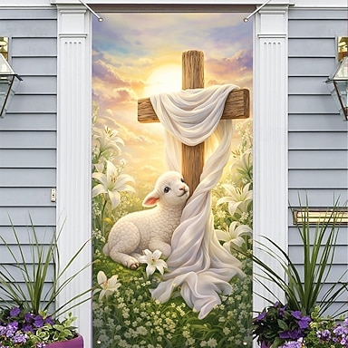 Pääsiäisovi, jossa on ristillä olevaa lammasta ja liljoja, kristillinen uskonnollinen koriste, täydellinen pääsiäissunnuntaihin, kevätlomaan ja ulkoilmajuhliin