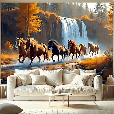 juoksevat villihevoset vesiputous luontomaisema syksyinen metsä kultaiset puut joki seinävaate seinävaate suuri kangas tausta olohuoneeseen makuuhuoneeseen kotitoimiston sisustus seinätaide