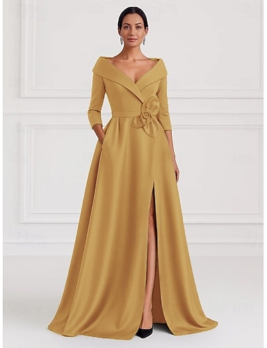 A-linja Kokopitkä Iltapuku Ball Gown Muodollinen mekko Tyylikäs Silkkinen 3/4 hiha Paitapuserokaula-aukko Häät Muodollinen Tasku Joustava satiini kanssa Shouder Flower