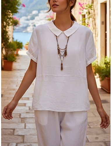 Naisten Paita Puuvillaiset pellavapaidat Pusero Tavallinen Böömi Tyylikäs Vapaa-aika Lyhythihainen Paitapuserokaula-aukko Tavalliset topit Päivittäin Pyhäpäivä Bile Sininen Valkoinen Laivaston sininen