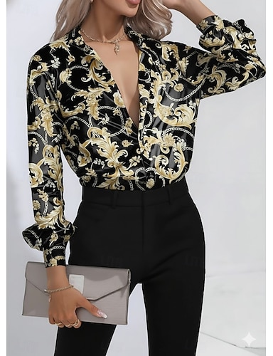 Naisten Paita Kukka Kuvitettu Geometrinen Vintage Tyylikäs Moderni Pitkähihainen Paitapuserokaula-aukko Tavalliset topit Päivittäin Pyhäpäivä Musta Viini Kulta Syksy Talvi