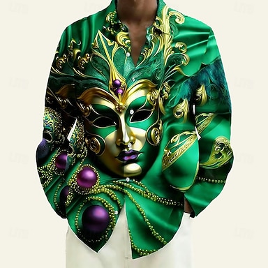 Mardi gras Miesten Karnevaali Helmet Naamio höyhenillä Paita Satiini paita Pukupaita Pitkähihainen Muoti rento Juhla Pyhäpäivä Kesä Kevät Sänkyjen avaus 3D-tulostus Napitettavat paidat Purppura Apila