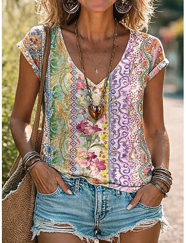 Naisten T-paita Painettu Kukka Kuvitettu Graffiti Böömi Vintage Vapaa-aika Lyhythihainen V kaula-aukko Tavalliset topit Päivittäin Sininen Purppura Oranssi Apila Kesä Kevät