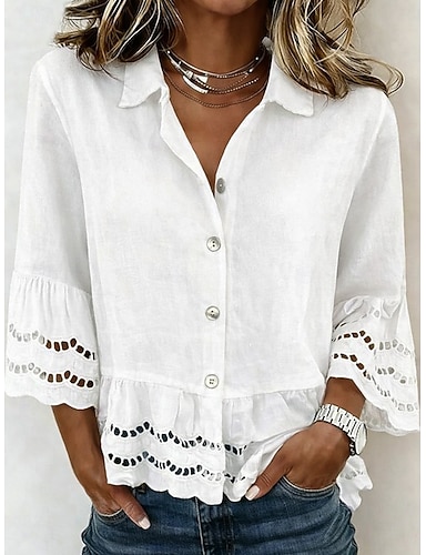 Naisten Pusero Napit Pitsi leikkaus Yhtenäinen väri Tyylikäs Loma Vapaa-aika 3/4 hiha Paitapuserokaula-aukko Tavalliset topit Päivittäin Sininen Valkoinen Kesä Kevät Syksy