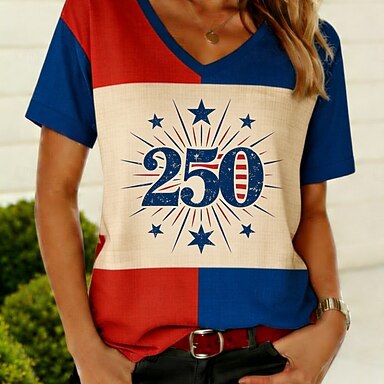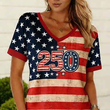 Amerikan itsenäisyyspäivä Naisten T-paita Painettu Kuvitettu Amerikan lippu Böömi Vintage Tyylikäs Lyhythihainen V kaula-aukko Tavalliset topit Päivittäin Bile Viikonloppu Sininen Rubiini Khaki Kes