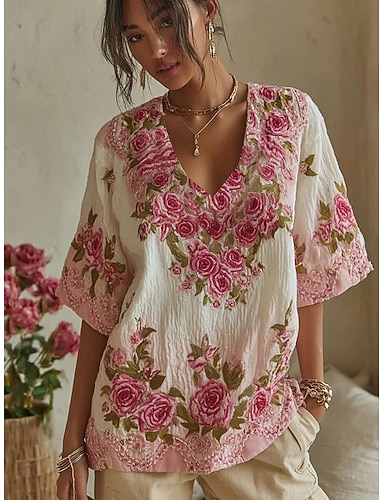Naisten viikinkipaita printtikuvioinen kukkakuvioinen graafinen boheemi vintage rento pitkähihainen pyöreä kaula-aukko normaali topit päivittäin viikonloppu lomavaate pinkki kesä kevät syksy