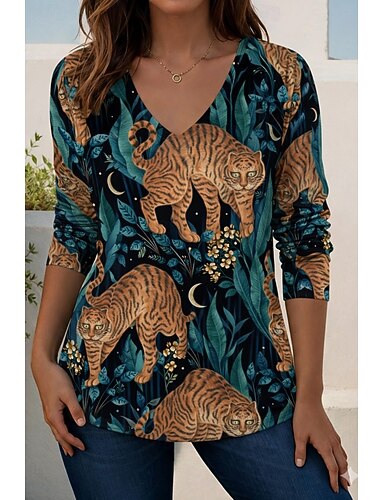 Naisten Paita Painettu Kukka Päivittäin Tyylikäs Perus Pitkähihainen V kaula-aukko Tavalliset topit Päivittäin Pyhäpäivä Keltainen Laivastosininen Purppura Kevät Syksy