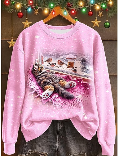 Naisten Pullover Painettu Kuvitettu Kissa Lämmin Klassinen Vapaa-aika Pitkähihainen Tiukka pyöreä kaula-aukko Tavalliset topit Kausaliteetti Koti Katu Sininen Punastuvan vaaleanpunainen Rubiini Syksy