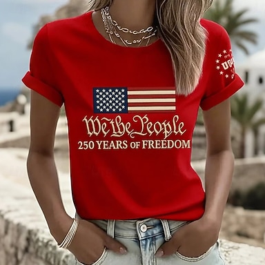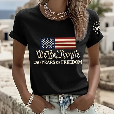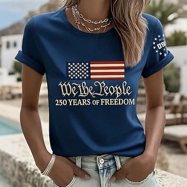 Amerikan itsenäisyyspäivä Naisten T-paita Painettu Kuvitettu Kirjain Amerikan lippu Vintage Tyylikäs Klassinen Lyhythihainen Tiukka pyöreä kaula-aukko Tavalliset topit Päivittäin Sininen Musta Rubiini