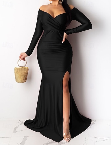 Naisten Pitkä mekko Maxi mekko Musta mekko Tanssiaispuku Juhlamekko Tyylikäs Moderni Iltajuhlat Juhla Erikoistilaisuus Normaali Tavallinen Pitkähihainen V kaula-aukko Sininen Musta Rubiini Apila