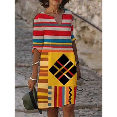 Naisten Midimekko Rento mekko Painatus mekko Vintage Päivittäin Hiekkaranta Viikonloppu Normaali Geometrinen Väripalikka 3/4 hiha Tiukka pyöreä kaula-aukko Keltainen Purppura Fuksia Oranssi Kes