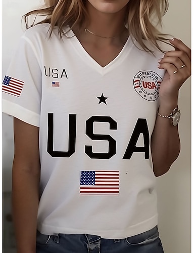 Itsenäisyyspäivä Patriottinen Naisten T-paita Painatus Graafinen Amerikan Lippu Vintage Tyylikäs Klassinen Lyhythihainen V-aukko Yleiset Paidat Päivittäinen Valkoinen-Sininen Valkoinen Punainen