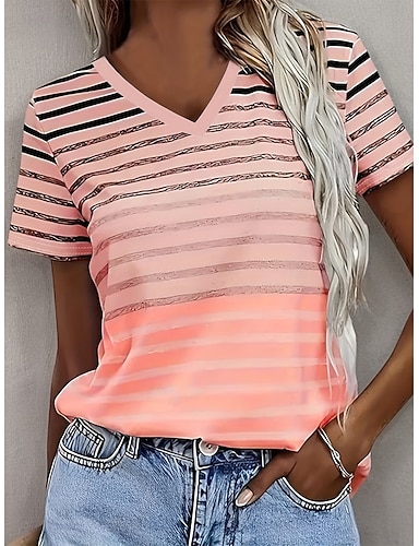 Naisten T-paita Painettu Raidoitettu Kuvitettu Geometrinen Raidoitettu Tyylikäs Klassinen Vapaa-aika Lyhythihainen V kaula-aukko Tavalliset topit Kausaliteetti Päivittäin Sininen Punastuvan