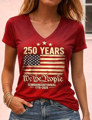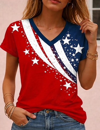 Amerikan itsenäisyyspäivä Naisten T-paita Väripaletti Painettu Kuvitettu Lippu Vintage Tyylikäs Klassinen Lyhythihainen V kaula-aukko Tavalliset topit Päivittäin Bile Viikonloppu Sininen Rubiini