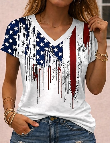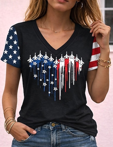 itsenäisyyspäivä amerikkalainen vuosipäivä patriottinen naisten T-paita printti graafinen lippu vintage tyylikäs klassinen lyhythihainen V-kaula-aukko säännölliset yläosat päivittäinen sininen musta