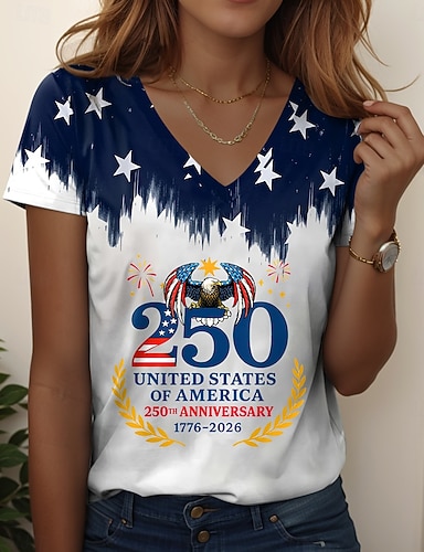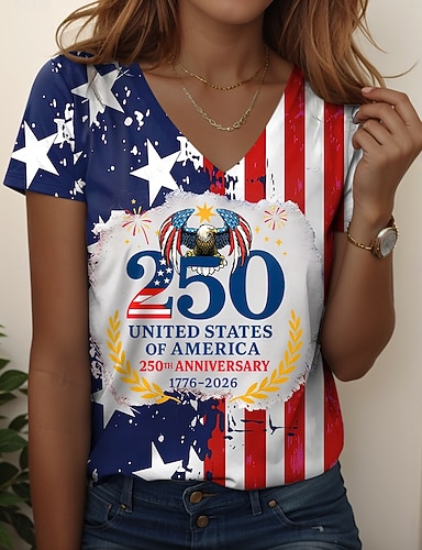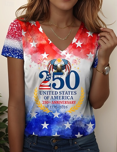 Amerikan itsenäisyyspäivä Naisten T-paita Väripaletti Painettu Kuvitettu Lippu Vintage Tyylikäs Klassinen Lyhythihainen V kaula-aukko Tavalliset topit Päivittäin Bile Viikonloppu Sininen Rubiini