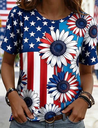 Amerikan itsenäisyyspäivä Naisten T-paita Painettu Kuvitettu Lippu Tyylikäs Klassinen Vapaa-aika Lyhythihainen Tiukka pyöreä kaula-aukko Pyöreä kaula-aukko Tavalliset topit Päivittäin Sininen Rubiini