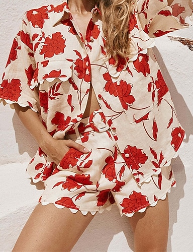 Naisten Puuvillaiset pellavapaidat Puuvillaset liinavaatteet Pellavasekoite Lyhythihainen Paitapuserokaula-aukko Kukka Painettu Muoti Katutyyli Arki-asut Deitti Rubiini Kesä Normaali