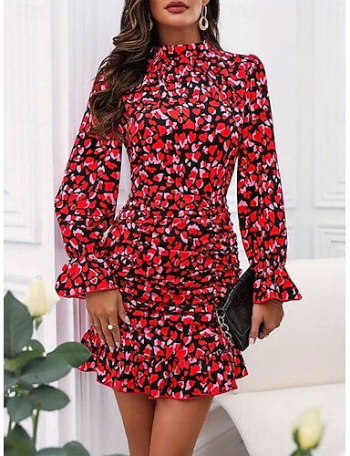 Naisten Mini mekko Kotelomekko Vapaa-aika Päivittäin Normaali Kukka Pitkähihainen poolokaulus Rubiini Kevät Syksy