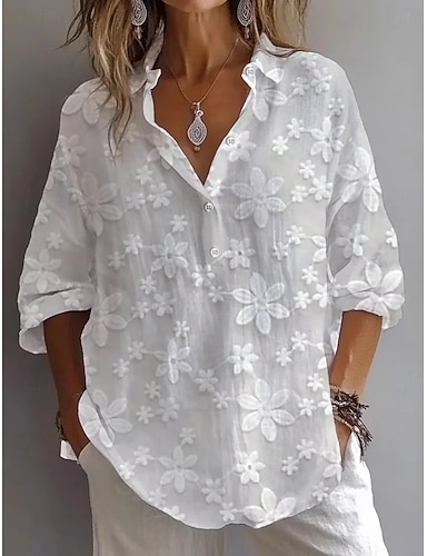 Naisten Pusero Keinopuuvillainen pellava Kirjailtu Painettu Epäsymmetrinen helma Kukka Tyylikäs 3/4 hiha V kaula-aukko Tavalliset topit Päivittäin Pyhäpäivä Bile Valkoinen Keltainen Rubiini Laivaston